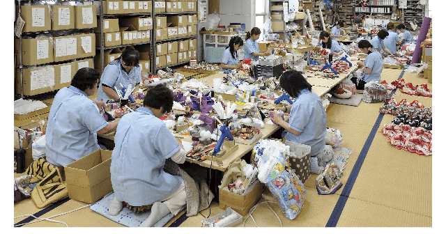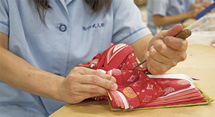 当社は、製造から卸・小売りまでの節句人形の総合商社として、全国約400を超える全国の人形専門店、百貨店に高級雛を出荷し、鴻巣の出荷額の60%以上を占める一番店です。当社の雛人形は、自社工芸士の手による完全オリジナル製品です。「埼玉県伝統工芸モデル工場」に指定されている自社の製作工房にて、着物の裂地選びから衣裳づくり、着せ付け、振り付け、頭差しの作業を女性スタッフが一体一体、心を込め手作業で進めています。