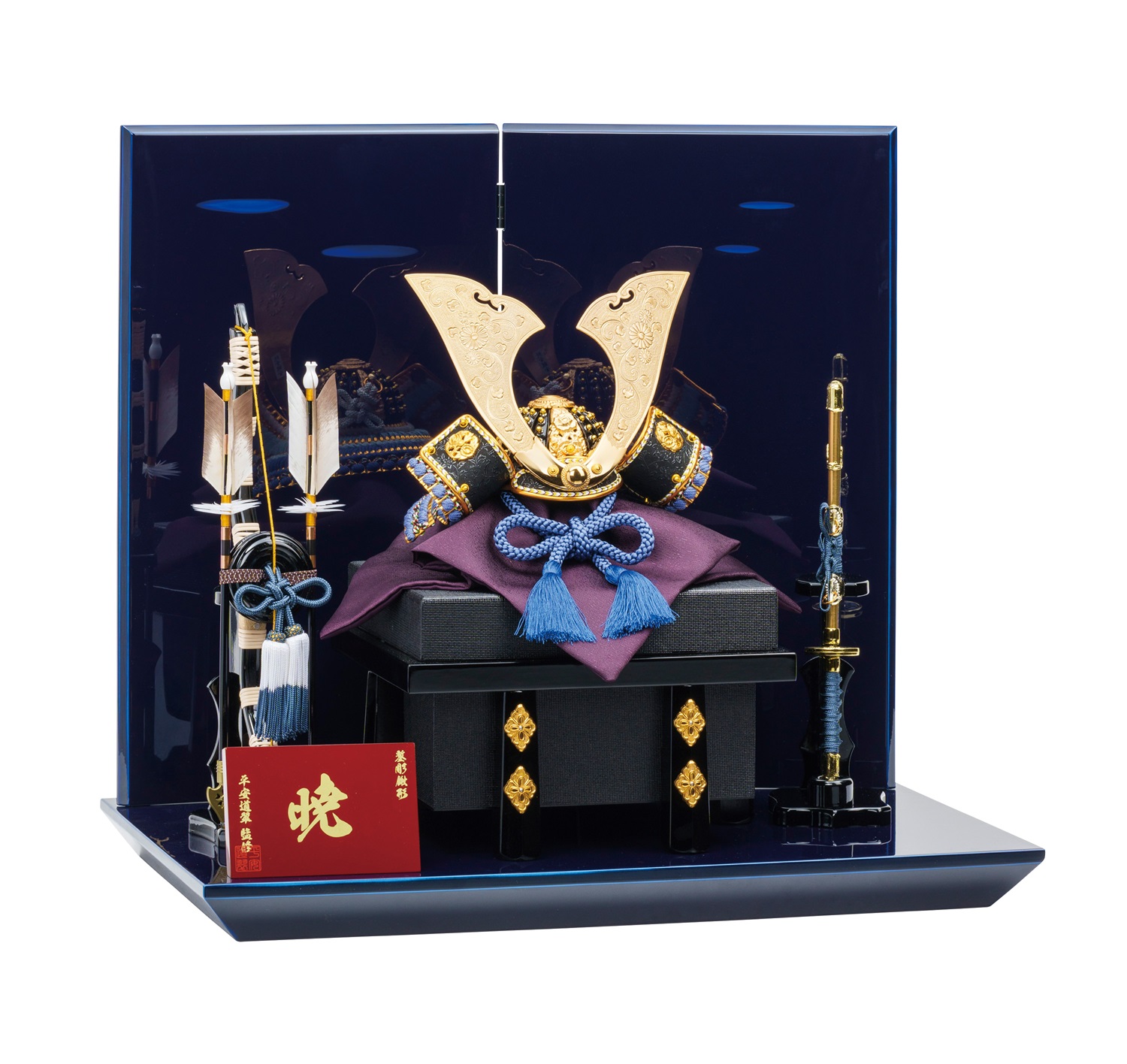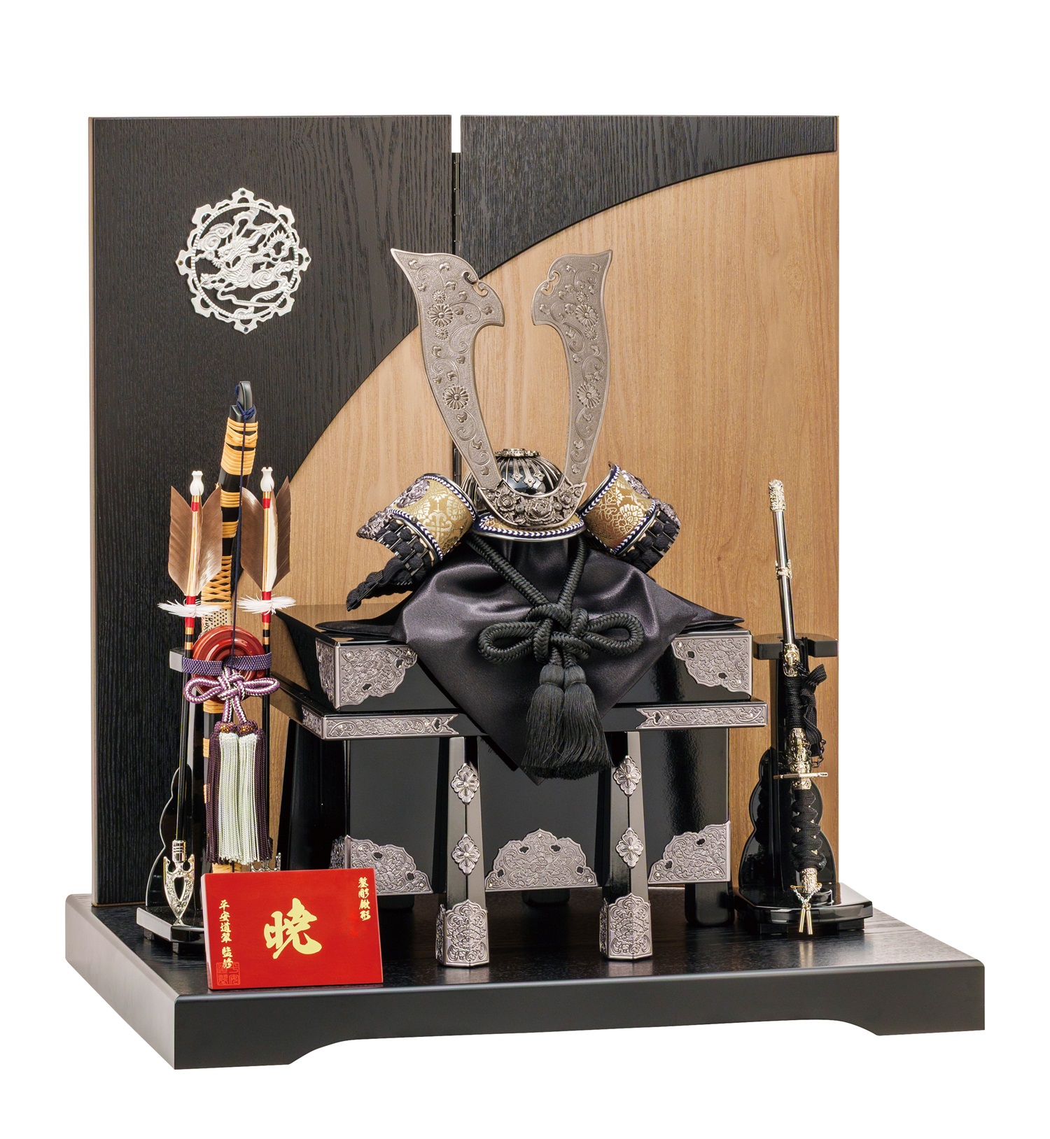 ●錣/青緑縅 ●鏨彫鍬形 ●別誂吹返/『誉勘』鳳凰唐草黒箔青裂地 ●屏風/銀箔・黒木目型抜 ●こだわり/真鍮鍬形、合鉢、細密小札、別誂吹返、総角結び