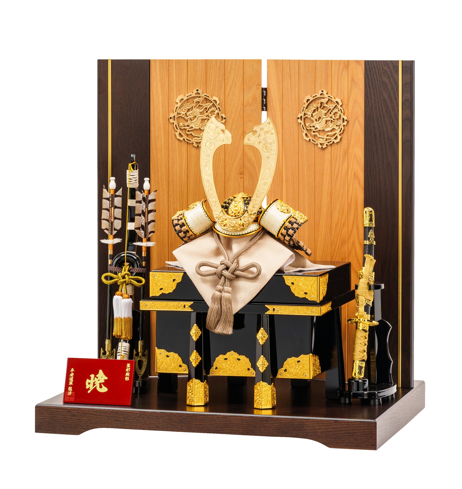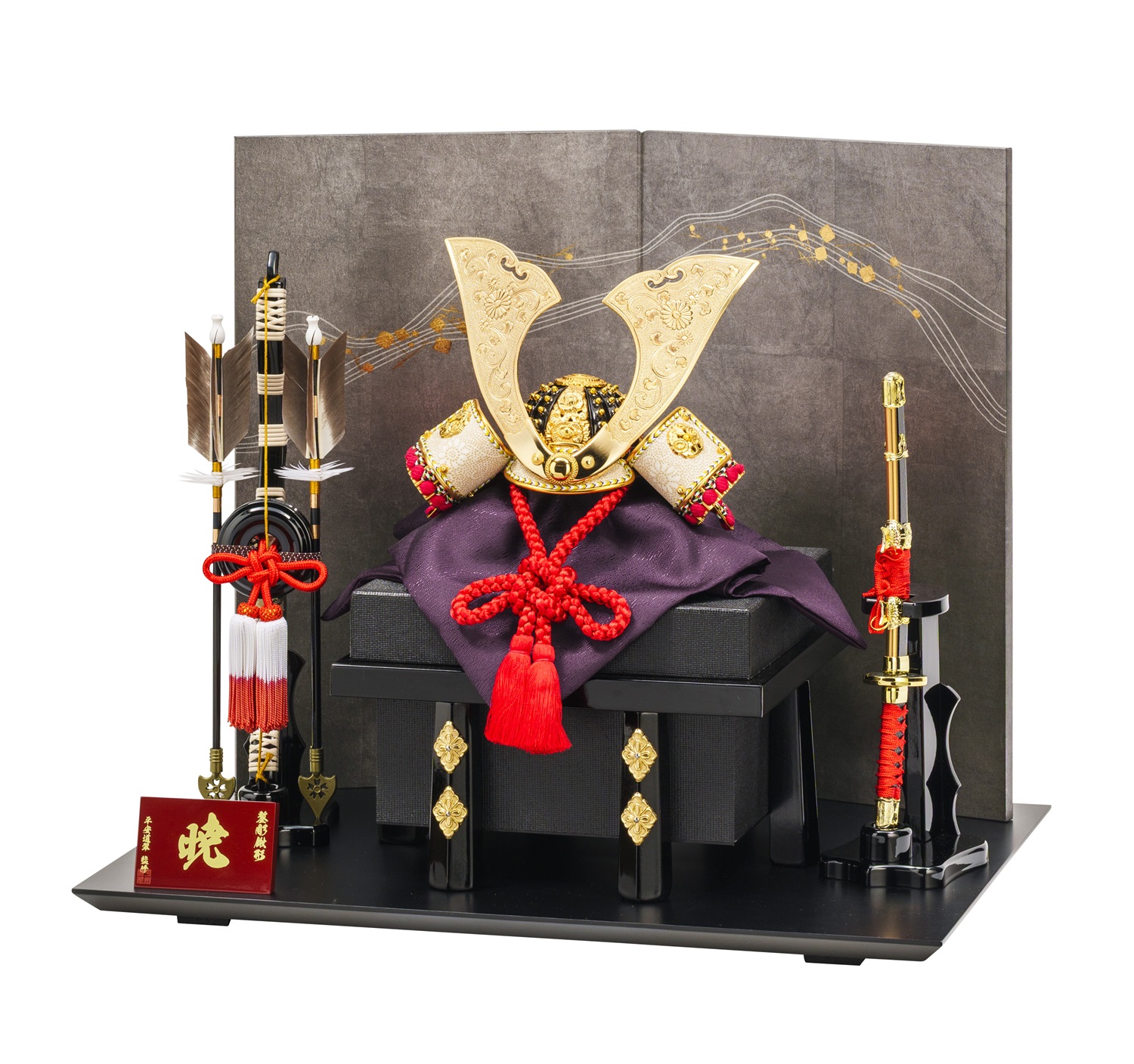 ●錣/ベージュ縅 ●鏨彫鍬形 ●別誂吹返/印伝革 ●屏風/京唐紙若松 ●こだわり/真鍮鍬形、合鉢、細密小札、別誂吹返、総角結び
