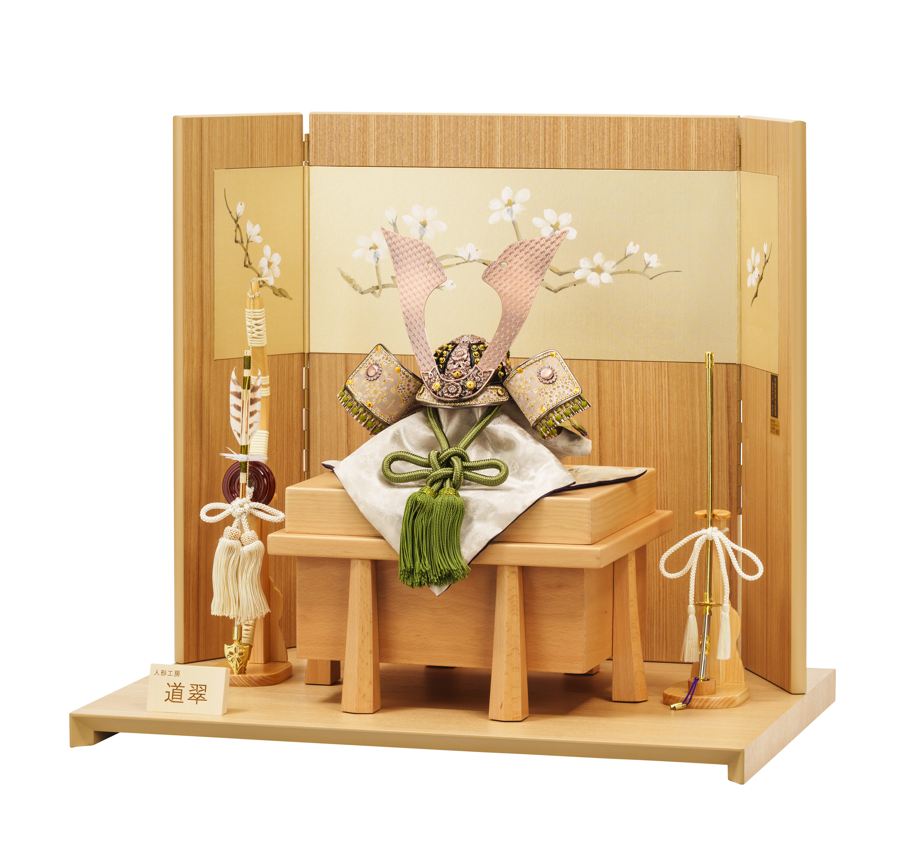 ●錣/茶縅 ●別誂吹返/『誉勘』正絹有職花菱裂地 ●屏風/駿河組子 ●こだわり/真鍮鍬形、細密小札、別誂吹返、総角結び