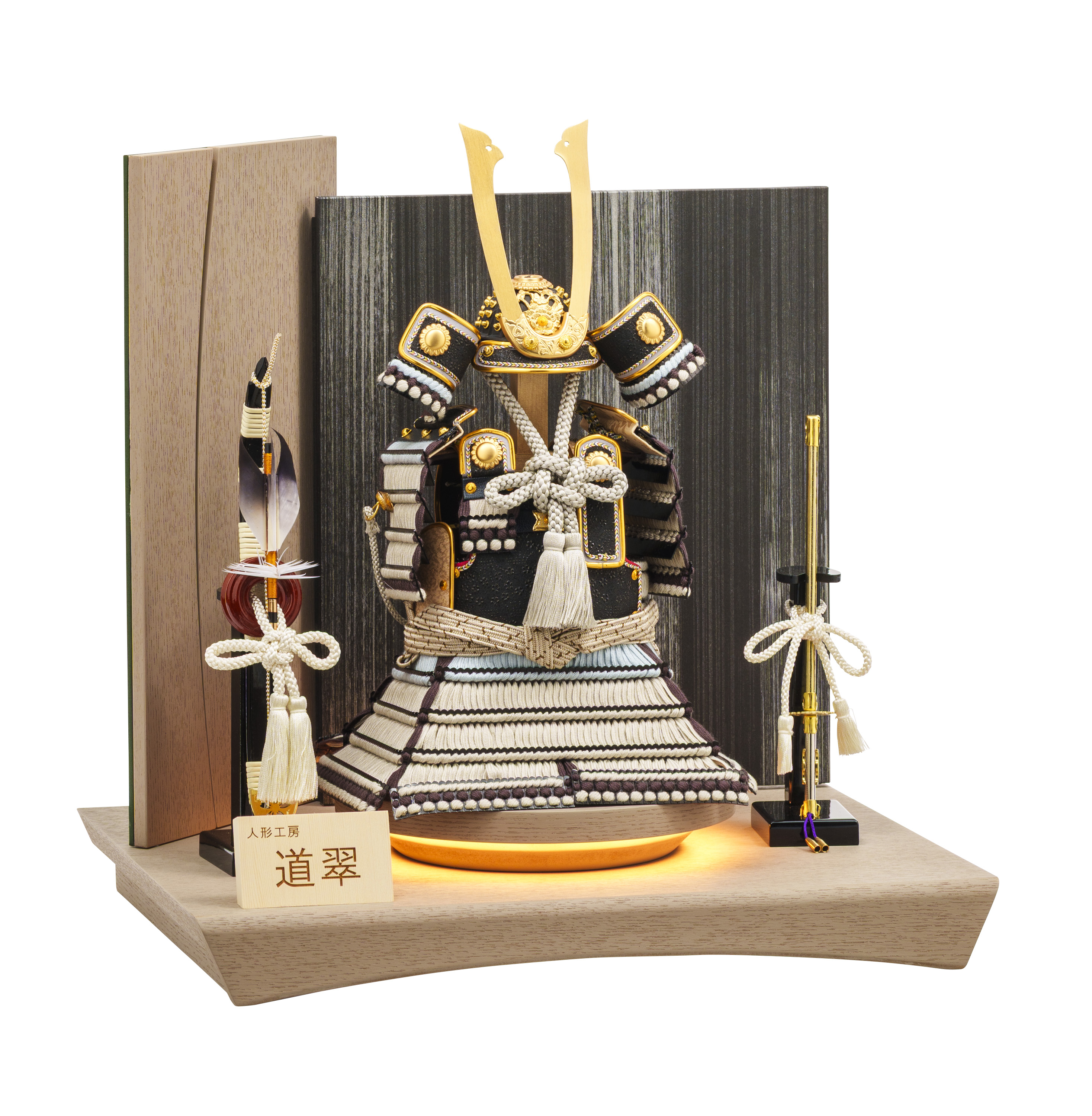 ●錣/グレー縅 ●別誂/印伝革 ●屏風/和紙・台/LED付 ●こだわり/真鍮鍬形、細密小札、別誂吹返、総角結び