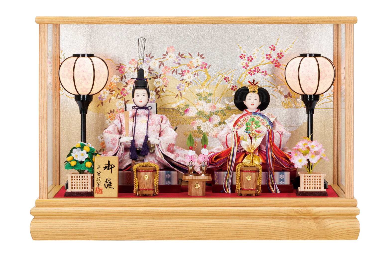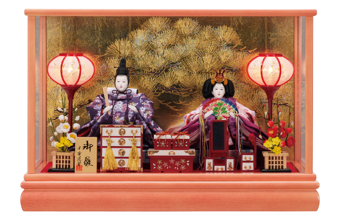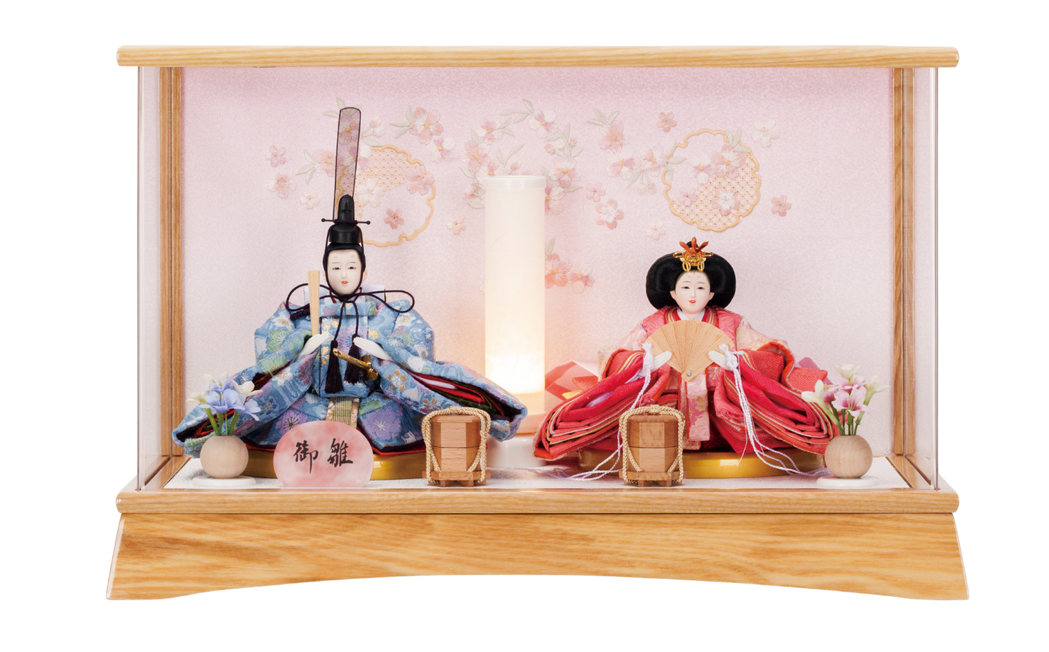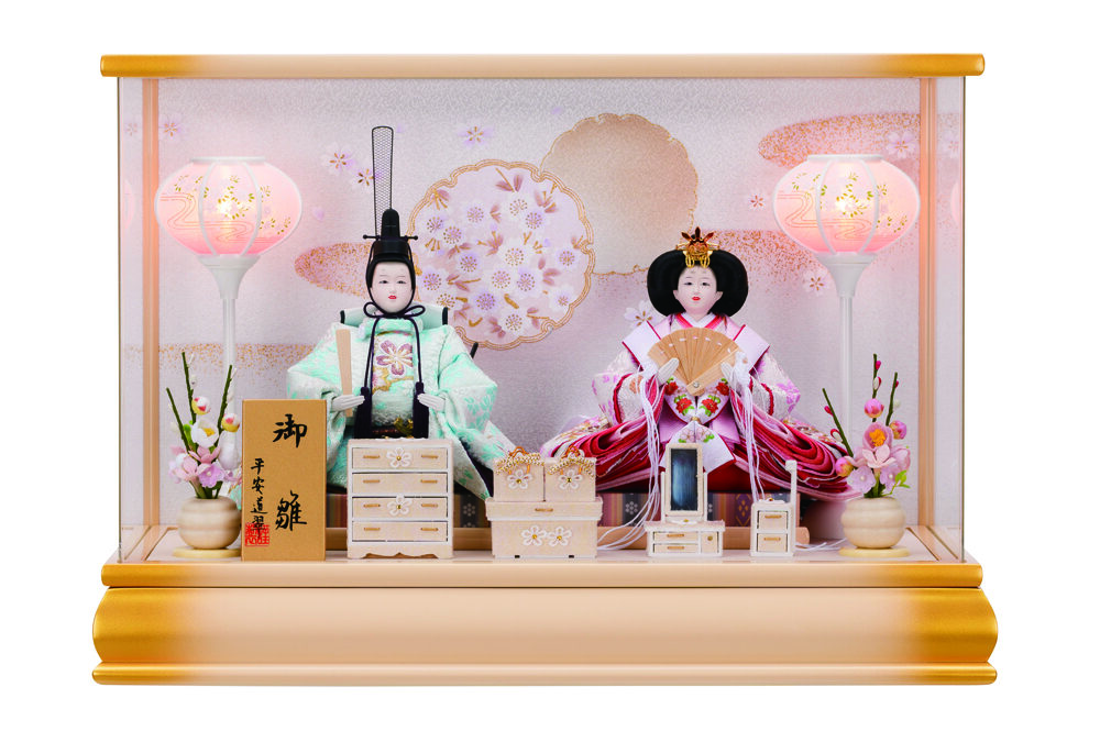 ケースに入っており、人形・道具が 固定されている飾りです。
