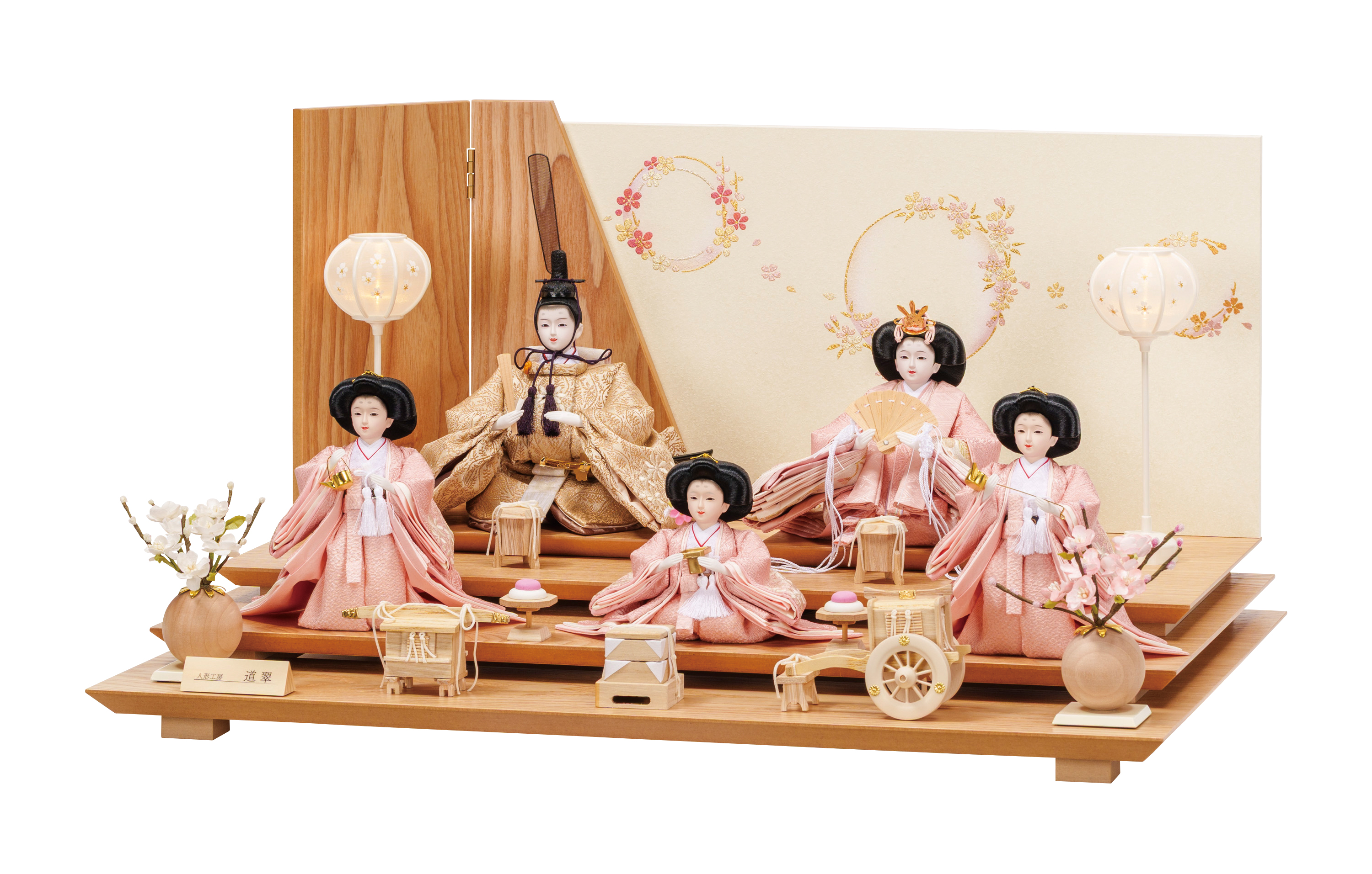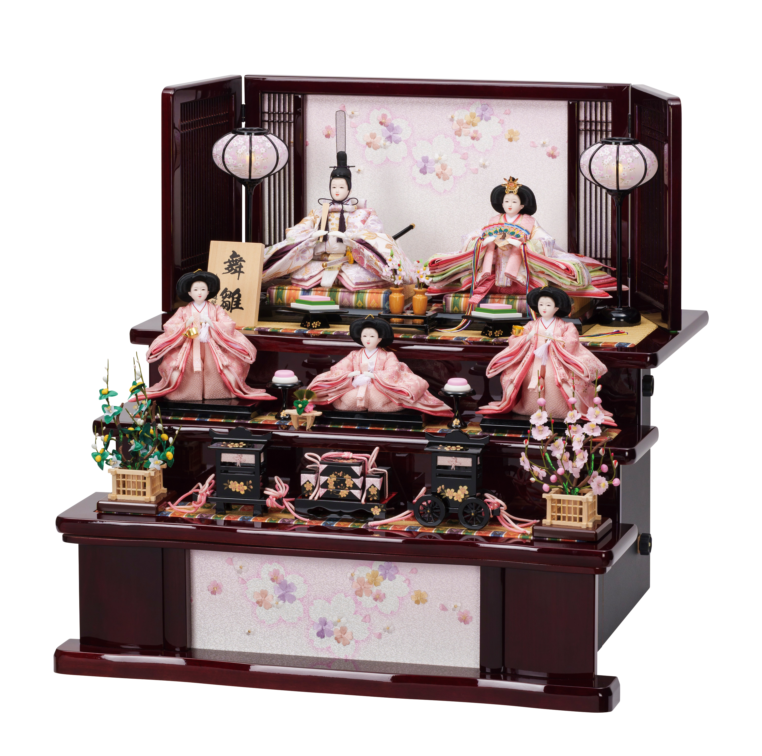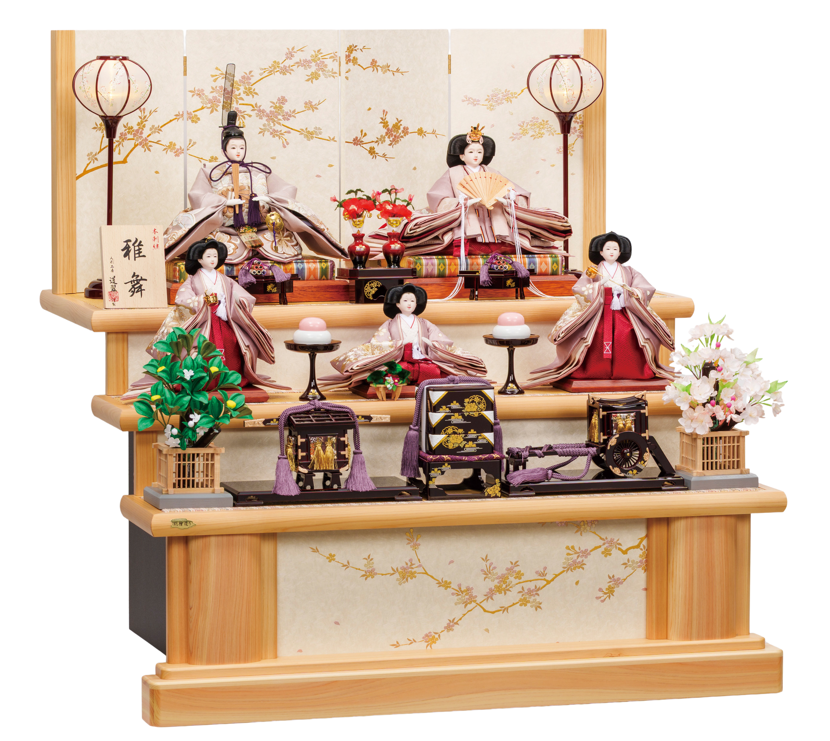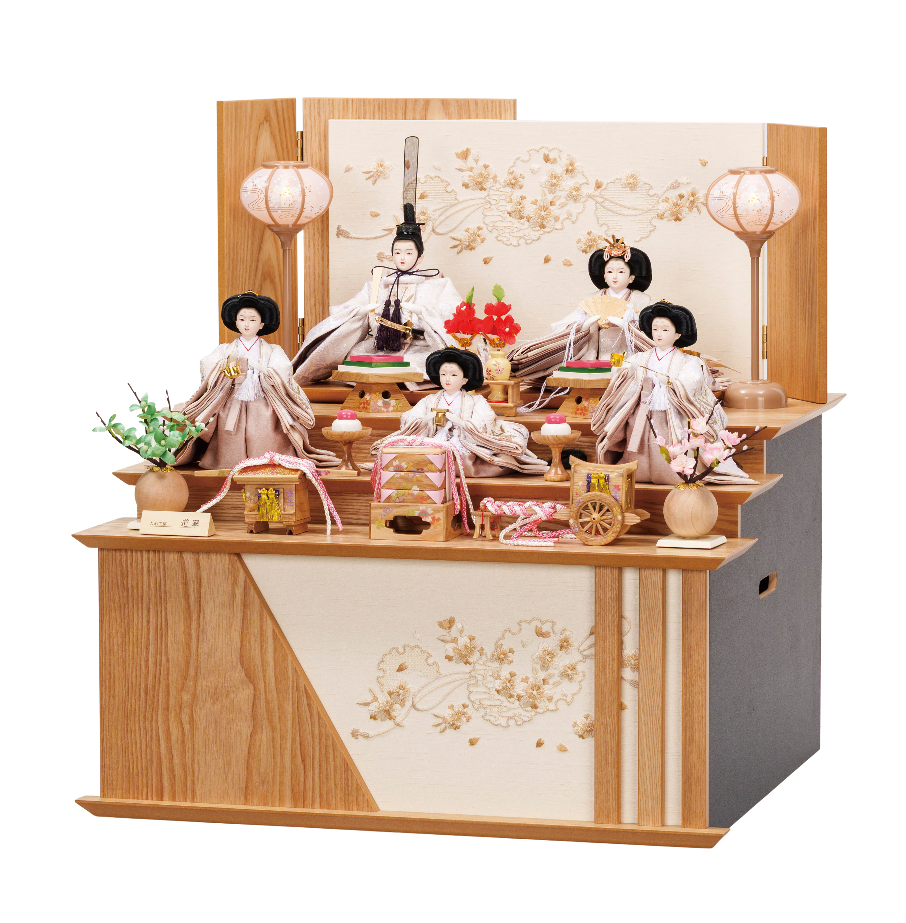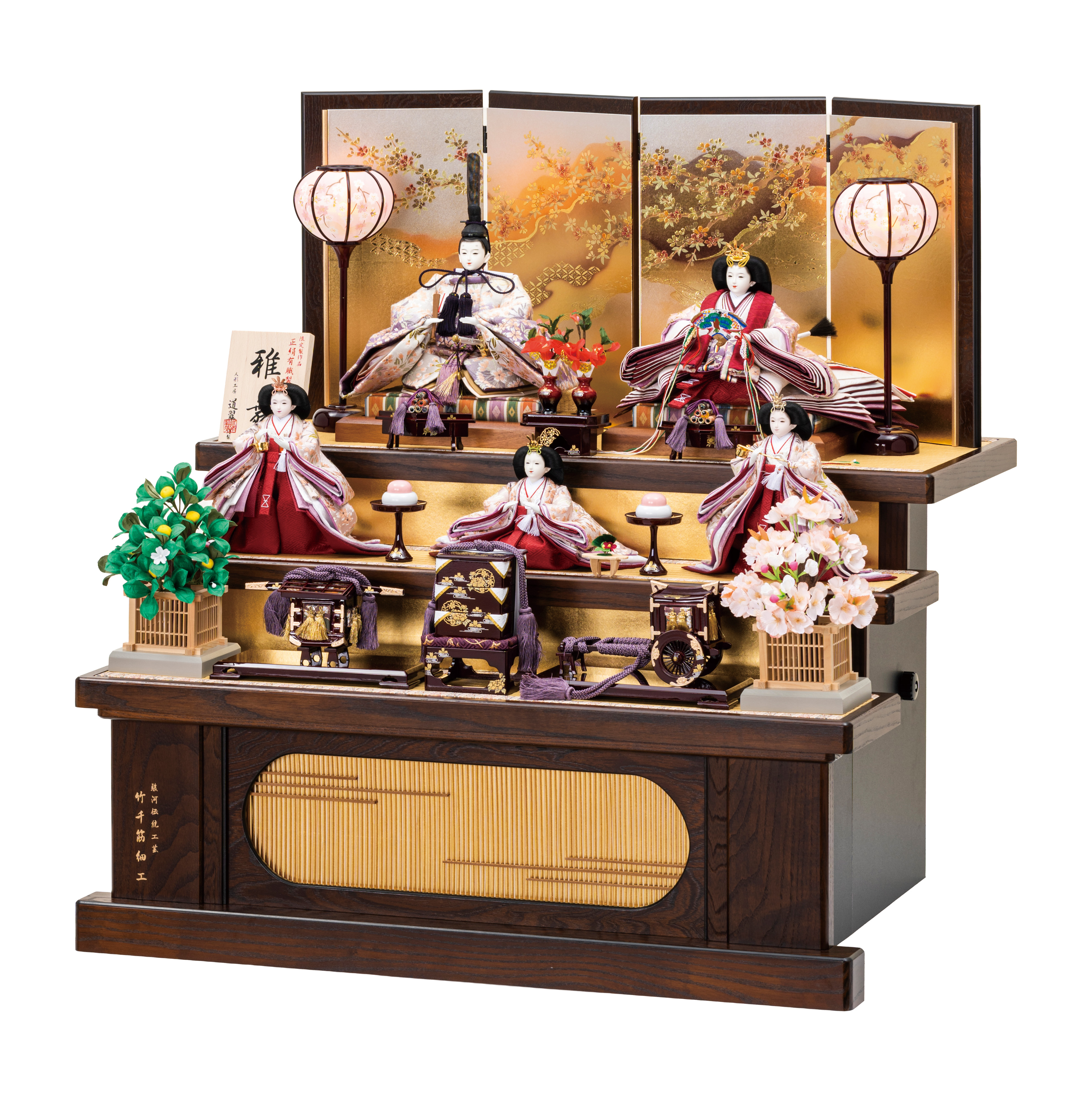 ●裂地/刺繍 ●屏風・台/刺繍 ●こだわり/小川和紙、魚袋、6枚縫合、刺繍裳袴、本着官女 ※組立ての要らない三段飾です