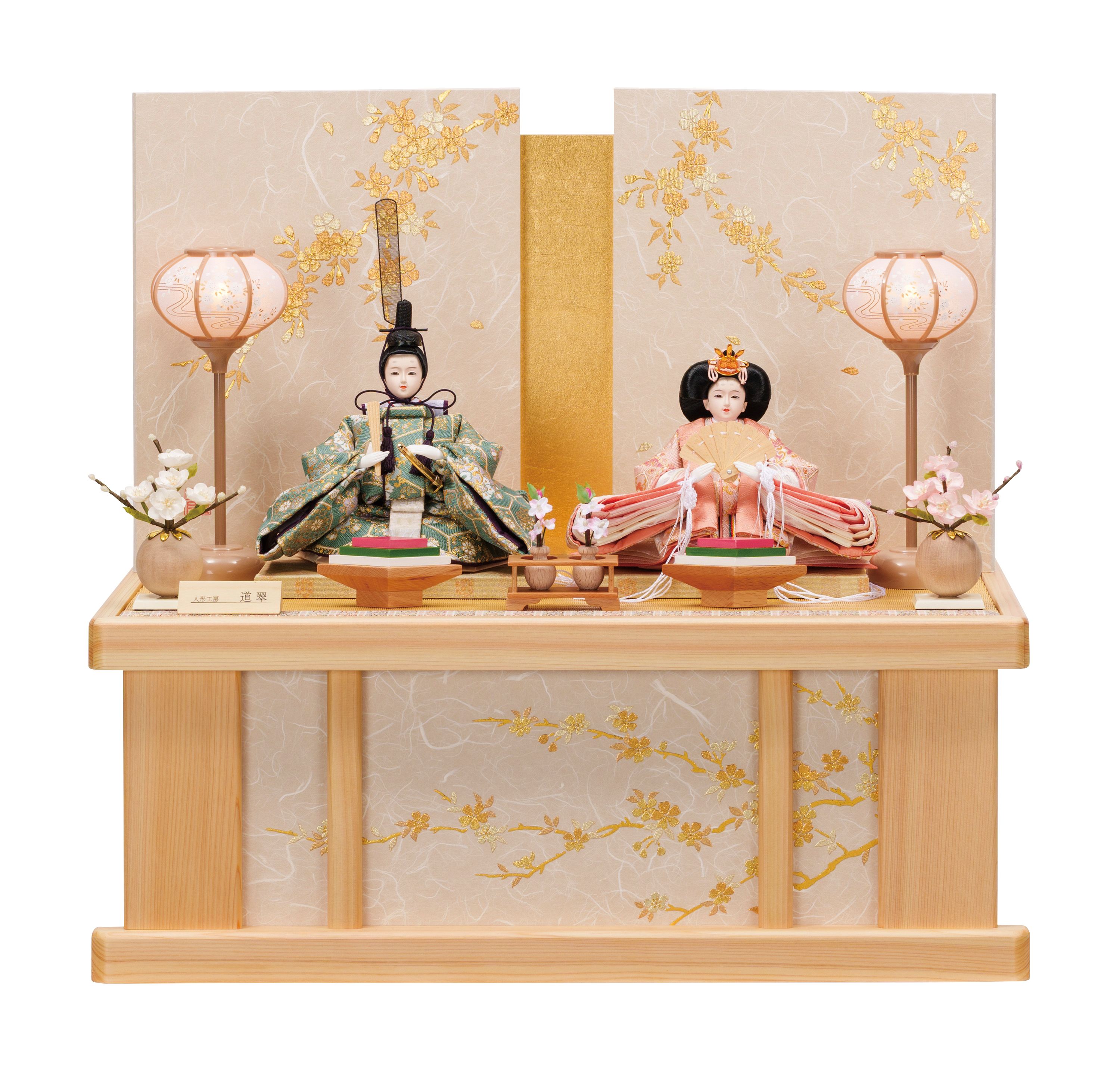 ●裂地/金彩刺繍 ●屏風・台/京金彩加工・桐箱 ●こだわり/小川和紙、木手、魚袋、6枚縫合、刺繍裳袴 ●収納箱タイプ