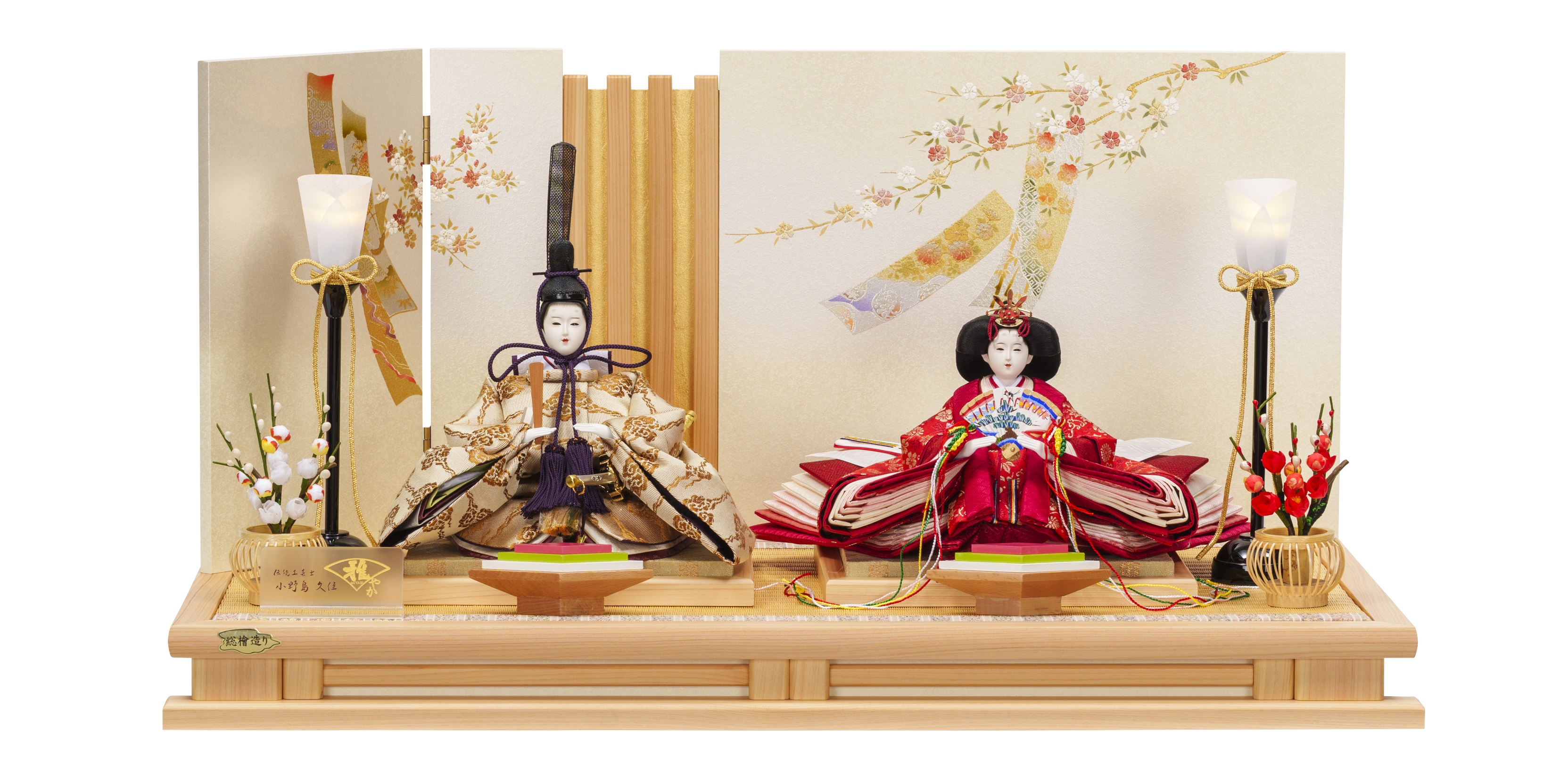 ●裂地/『誉勘』正絹六綾地雲文様裂地 ●屏風・台/京金彩加工・天竜桧 ●こだわり/小川和紙、木手、本石帯、魚袋、本唐衣、6枚縫合、刺繍裳袴